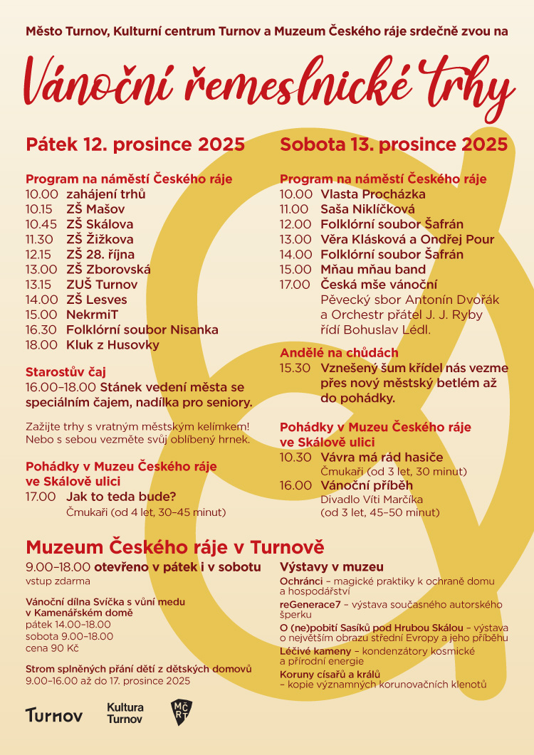 Vánoční řemeslnické trhy připravuje Muzeum Českého ráje v Turnově a Kultura Turnov ve spolupráci s městem Turnov.