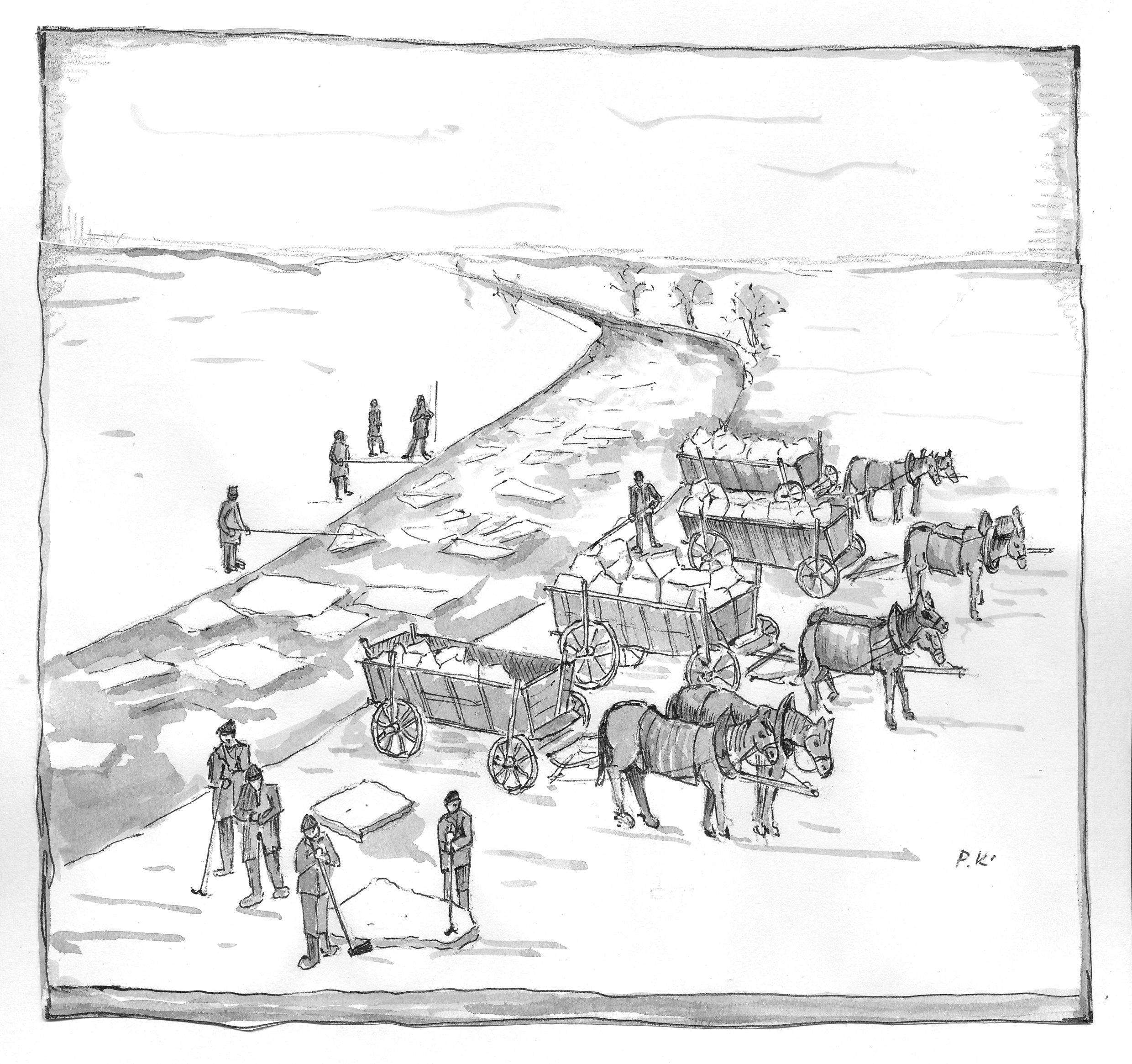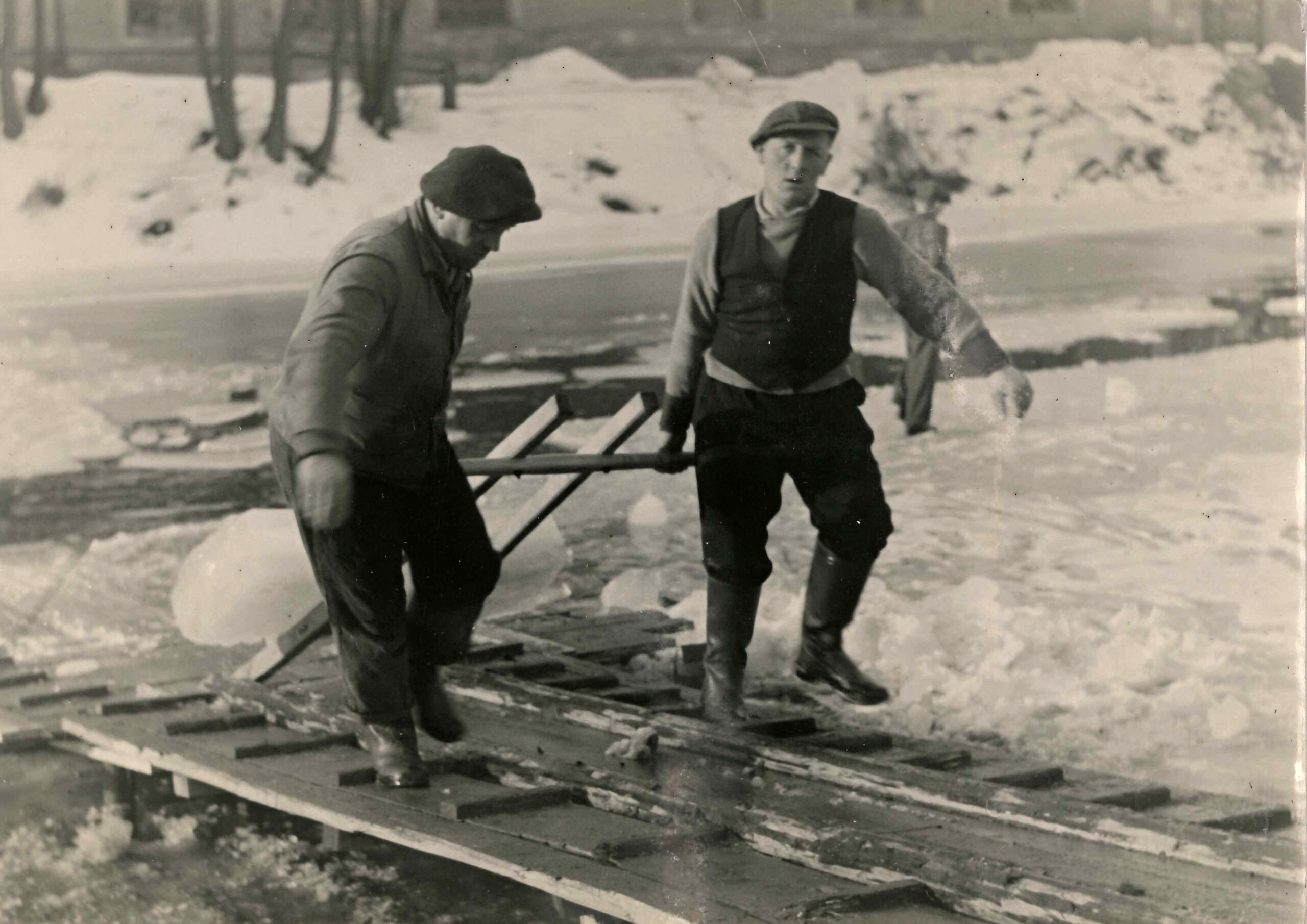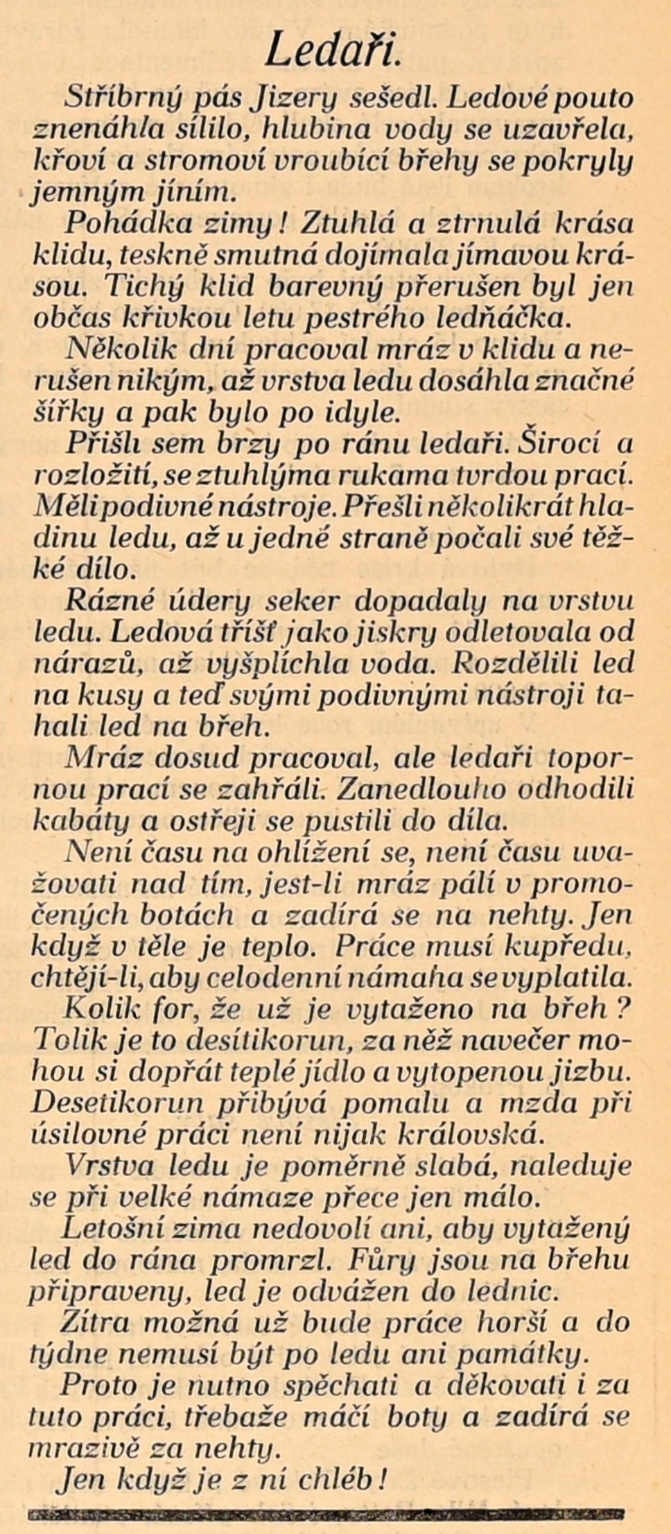 „leden byl s mrazy, takže Slepé rameno zamrzlo. Pivovar Táborský z Turnova tu ledoval, takže se pilně jezdilo s ledem do Turnova. Ledaři dostali od 1 fůry 8 Kč, hospodáři za dovoz 22 Kč. Jezdilo se 4krát denně až s 10 povozy“.