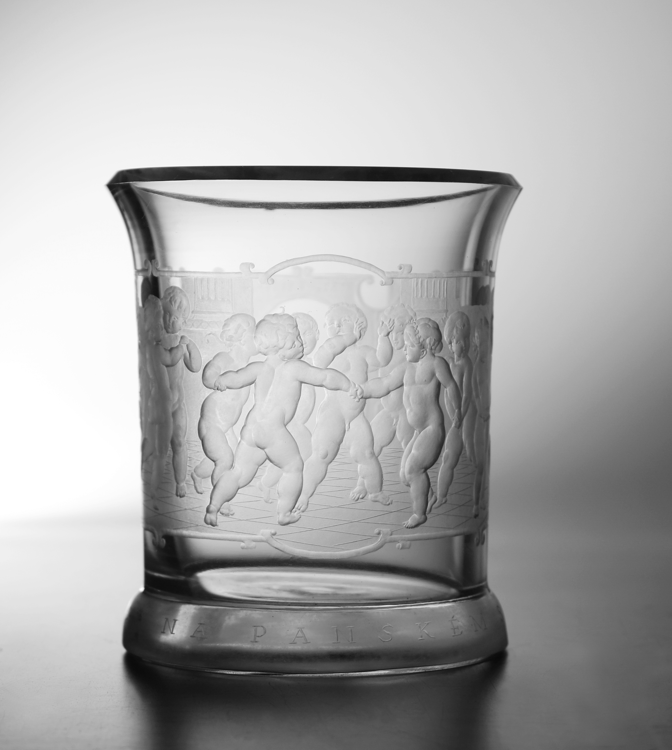 Karel Tuček: Život na panském sídle, váza z čirého skla, zdobená rytinou podle Josefa Mánesa, 1931