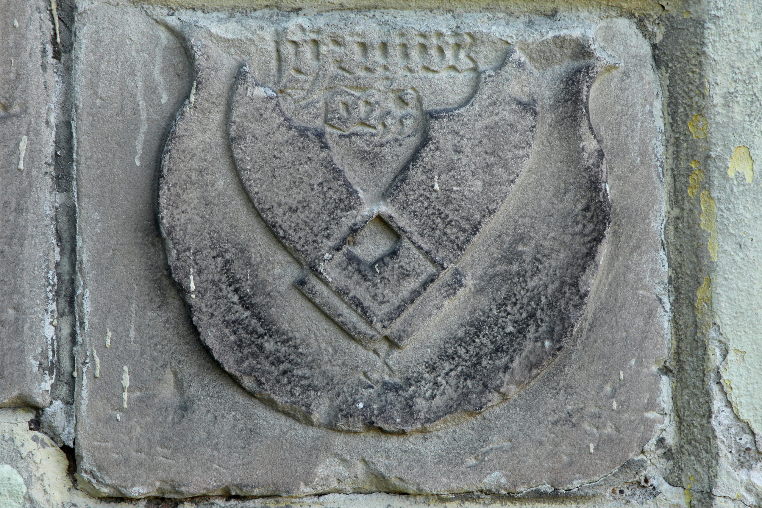 Obr_1 – Pískovcová deska z roku 1538 na severní straně věže kostela sv. Mikuláše v Turnově se znaky sladovnického řemesla – dvě sladovnické limpy netypicky uspořádané do tvaru písmene V.