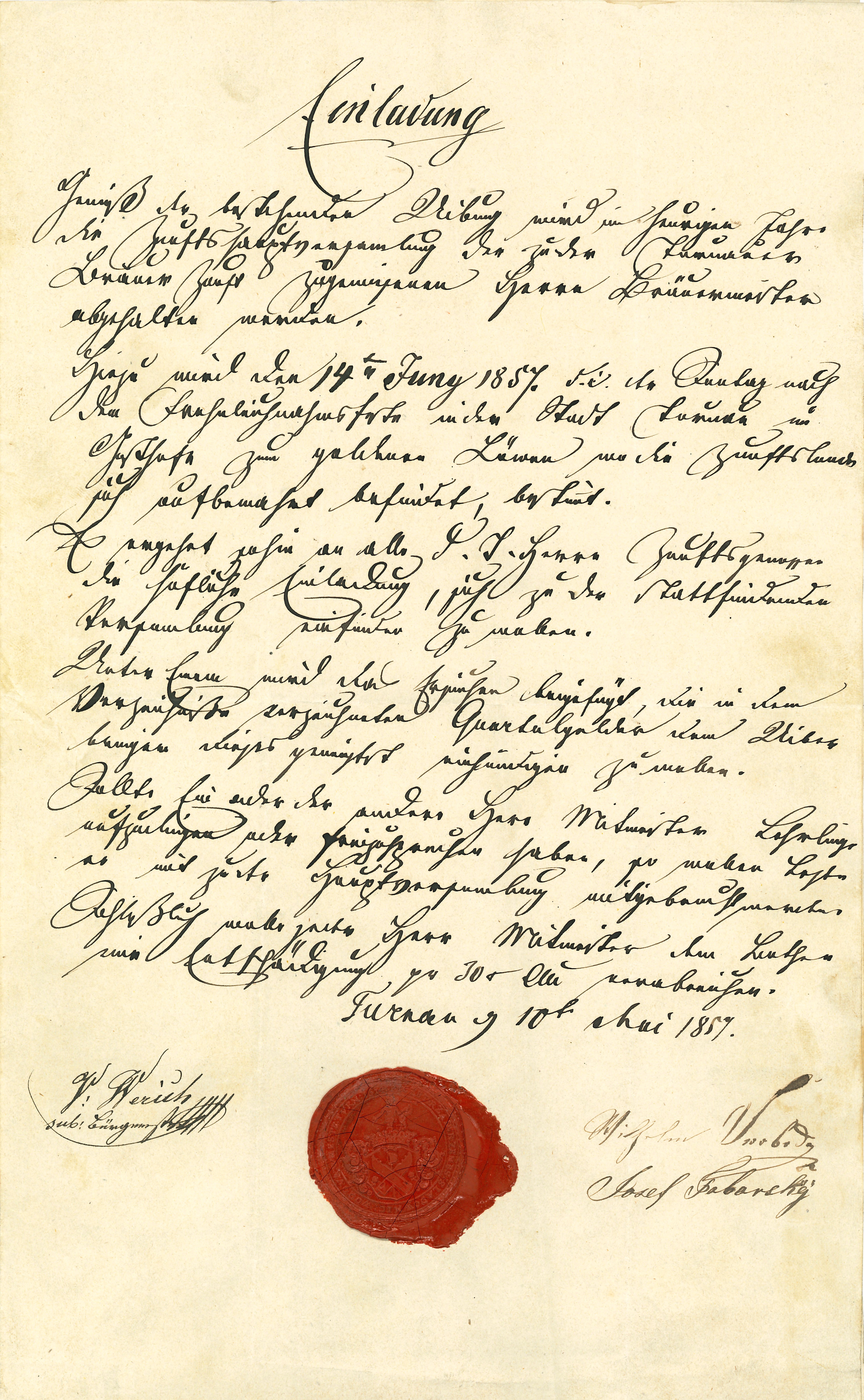 Obr. 3 – Pozvánka na cechovní schůzi konanou 14. června 1857 v hostinci U Zlatého lva, čp. 4 na náměstí. (Státní okresní archiv Semily)