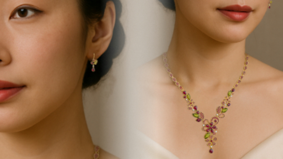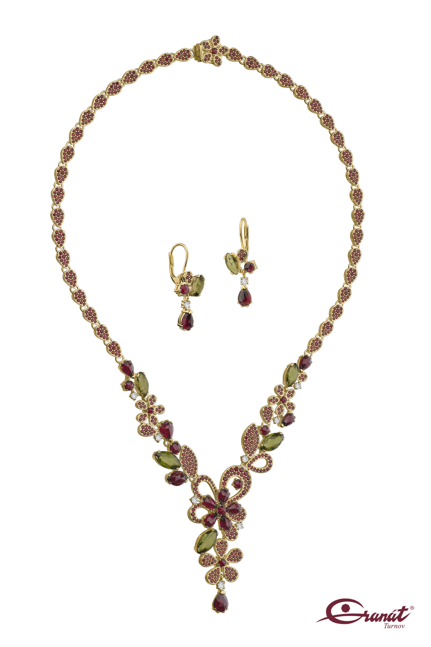 Soupravu tvoří náhrdelník a náušnice ze žlutého zlata o ryzosti 585/1000, osazené dvěma výjimečnými kameny s českým původem. Dominantní je český granát – jedinečný svou sytě rudou barvou a historickou hodnotou, který doplňuje zelený vltavín, přírodní sklo meteoritického původu. Třetím prvkem je diamant – kámen, který ve špercích zdůrazňuje jejich výjimečnost.