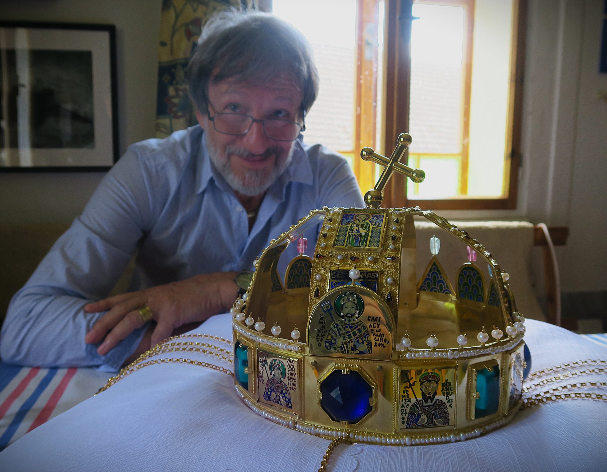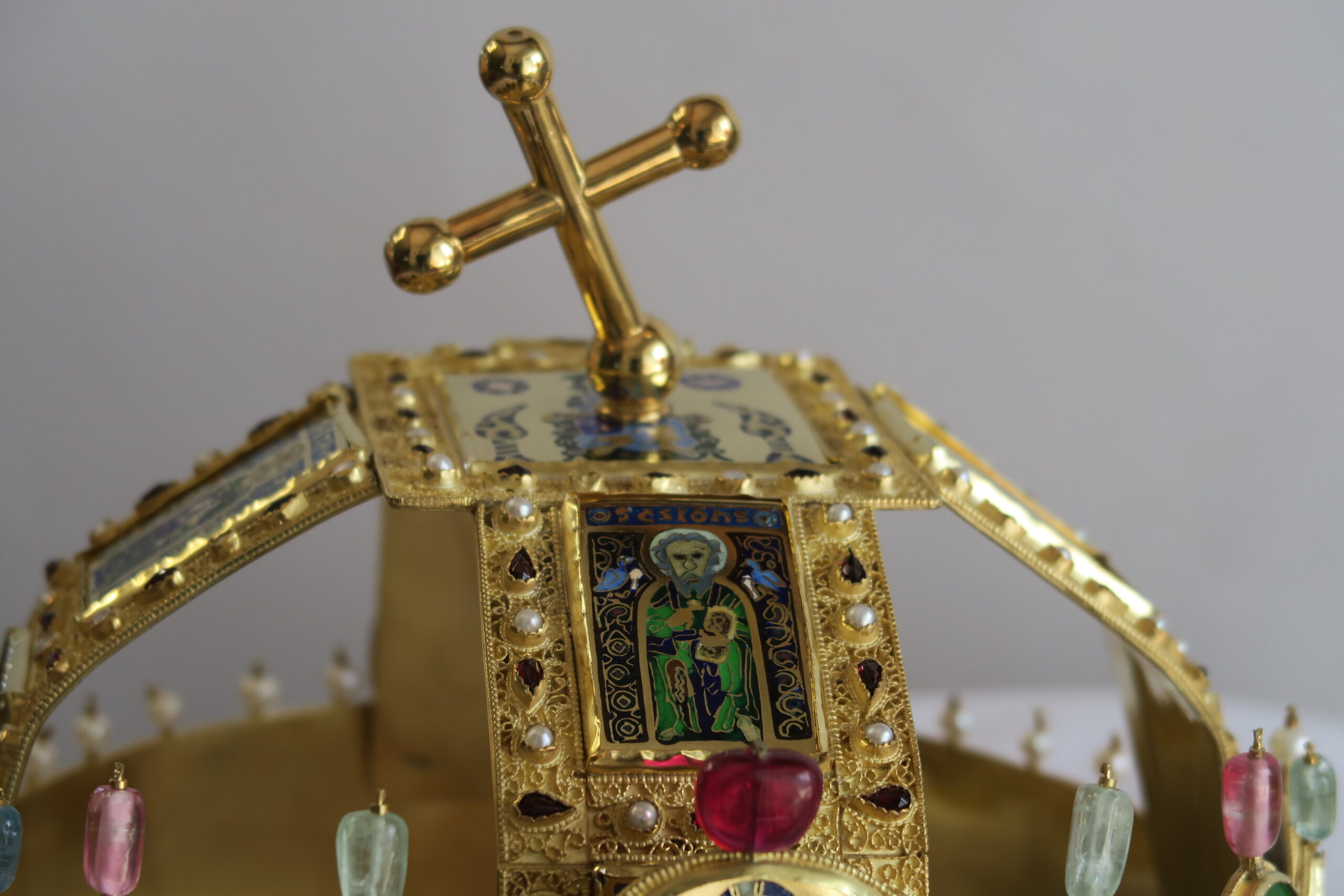 Z bohaté sbírky replik korunovačních klenotů, které zlatník Jiří Urban dosud vytvořil, chyběla v turnovském muzeu k vidění pouze jediná – Svatoštěpánská koruna uherských králů. Tento významný historický artefakt, stejně jako další středověké královské insignie, má poutavou minulost, která se promítá do jeho podoby. Základ koruny tvoří byzantská obroučka zdobená drahokamy, emailovými medailony světců a zavěšenými přívěsky (pendule). Mezi 11. a 13. stoletím byla doplněna o obloukové kamary a nakloněný křížek, který vzbuzuje řadu teorií – od poškození při ukrytí až po záměrné ohnutí na příkaz Habsburků s cílem oslabit její symbolickou moc. Ani maďarští historici se však na skutečném důvodu tohoto sklonu neshodují.