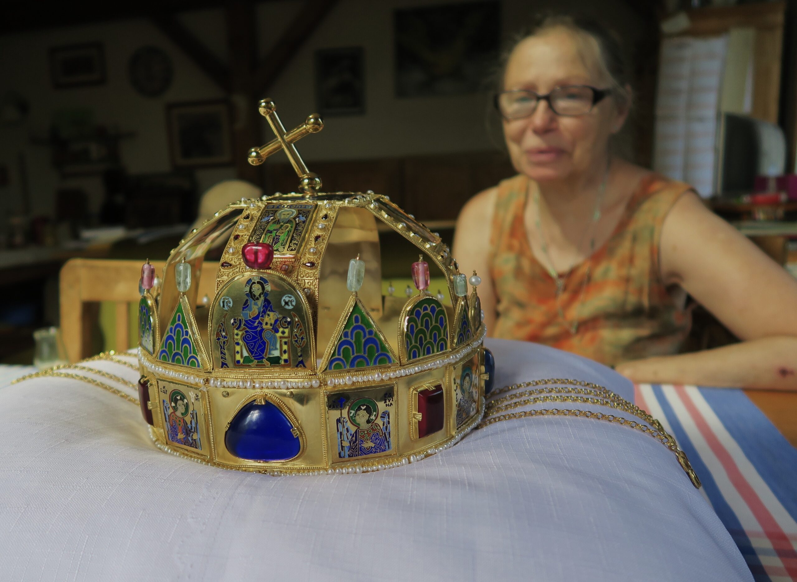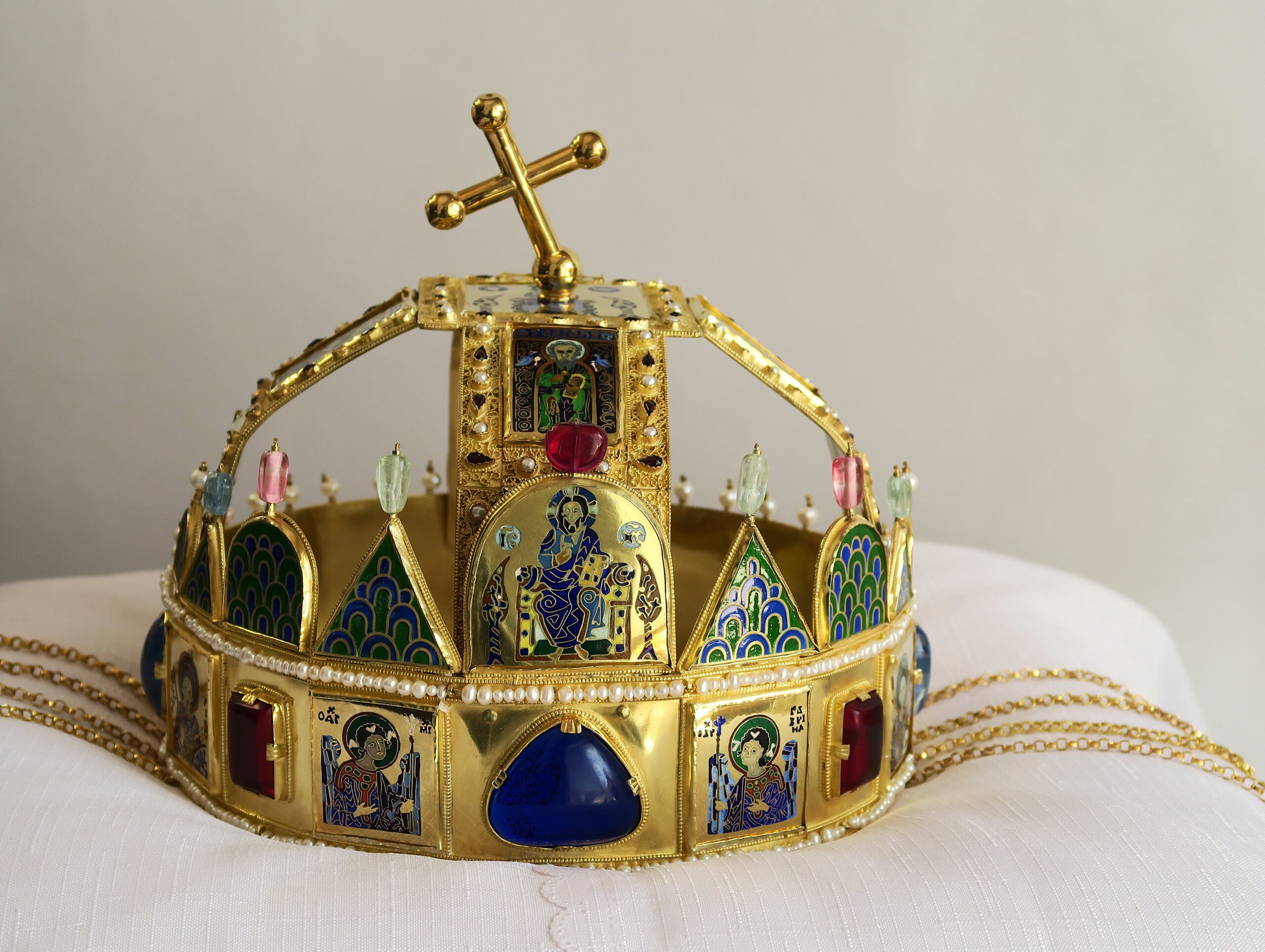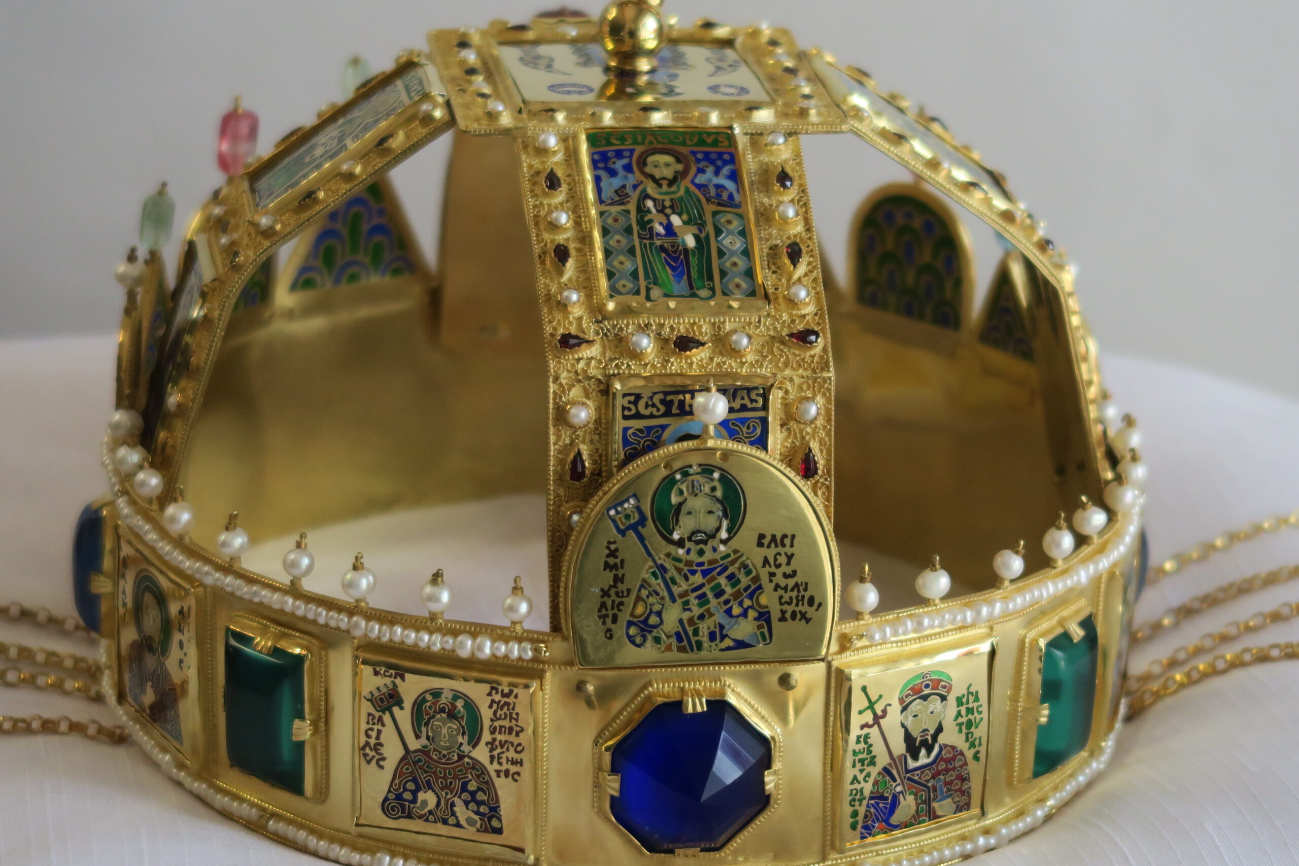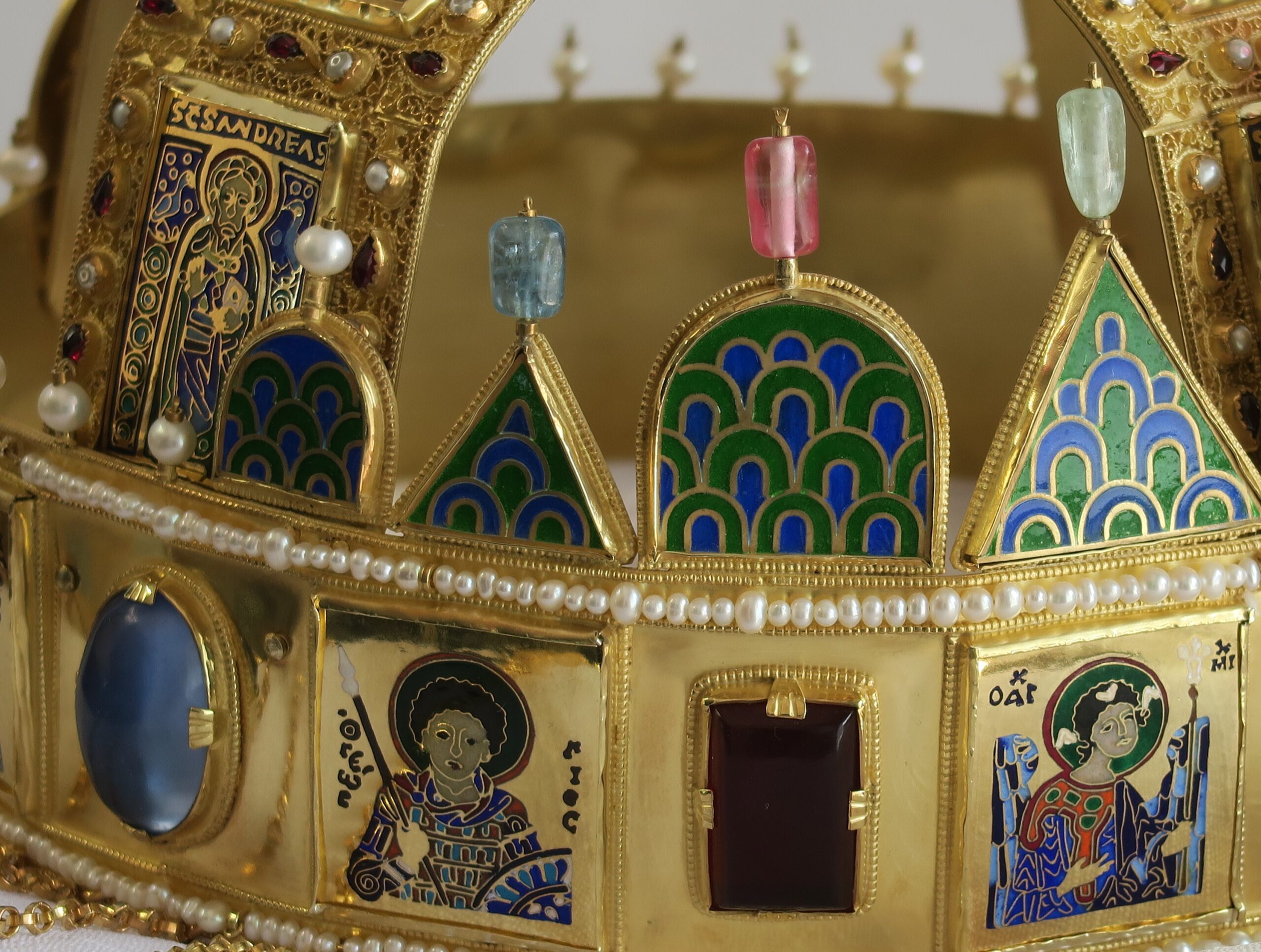 Z bohaté sbírky replik korunovačních klenotů, které zlatník Jiří Urban dosud vytvořil, chyběla v turnovském muzeu k vidění pouze jediná – Svatoštěpánská koruna uherských králů. Tento významný historický artefakt, stejně jako další středověké královské insignie, má poutavou minulost, která se promítá do jeho podoby. Základ koruny tvoří byzantská obroučka zdobená drahokamy, emailovými medailony světců a zavěšenými přívěsky (pendule). Mezi 11. a 13. stoletím byla doplněna o obloukové kamary a nakloněný křížek, který vzbuzuje řadu teorií – od poškození při ukrytí až po záměrné ohnutí na příkaz Habsburků s cílem oslabit její symbolickou moc. Ani maďarští historici se však na skutečném důvodu tohoto sklonu neshodují.
